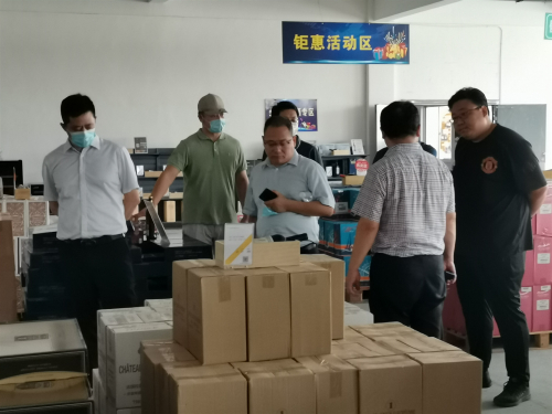 来访一行在华剑青的陪同下先后参观了公司30000平米标准的保税食品备案仓库(包括进口葡萄酒仓、进口日化用品仓、进口吉他专仓)及仓储式商品展示大厅,实地了解了绿辰的企业文化、发展历程、运营情况、模式创新、全国布局等方面取得的成果以及未来规划,双方就企业发展现状和未来进行了深入的沟通和交流。参观过程中,华剑青着重对公司仓储式商品展示交易大厅进行了细致的讲解,包括进口商品种类,各国进口葡萄酒、名庄酒等吸引了大家频频停足注目。