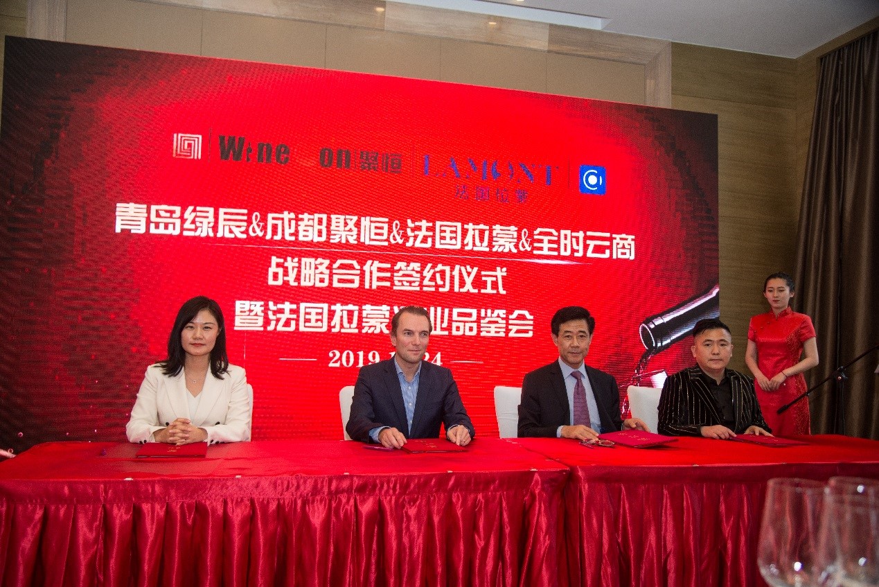 10月24日, 青岛绿辰进口商品展示推广有限公司同成都聚恒广告有限公司、法国拉蒙酒业集团、全时云商在天津第101届全国秋季糖酒会举行了隆重的战略合作签约仪式。青岛绿辰进口商品展示推广有限公司董事长穆文斌、成都市聚恒广告有限公司董事长杨钊、法国拉蒙酒业总经理Bertrand GALLOIS、全时云商总经理孙瑶参加了签约仪式,来自全国的各大媒体代表共同见证和报道了签约仪式。