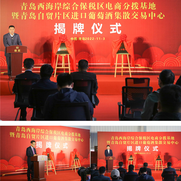 11月3日上午,青岛西海岸综合保税区电商分拨基地暨青岛自贸片区进口葡萄酒集散交易中心揭牌仪式在青岛绿辰进口商品展示推广有限公司成功举行。黄岛海关副关长王爱民、青岛自贸片区工委委员、管委副主任郭宝存、青岛自贸片区航运物流部部长周宇翔、青岛西海岸综合保税区服务中心党委书记牟军伟、抖音集团酒水项目总监张庆波、法国拉蒙酒业电子商务事业群总经理马志强、狮王日化青岛有限公司副董事长任洪涛、顺丰、京东、德邦青岛地区负责人等相关企业代表及青岛电视台媒体朋友们出席活动。