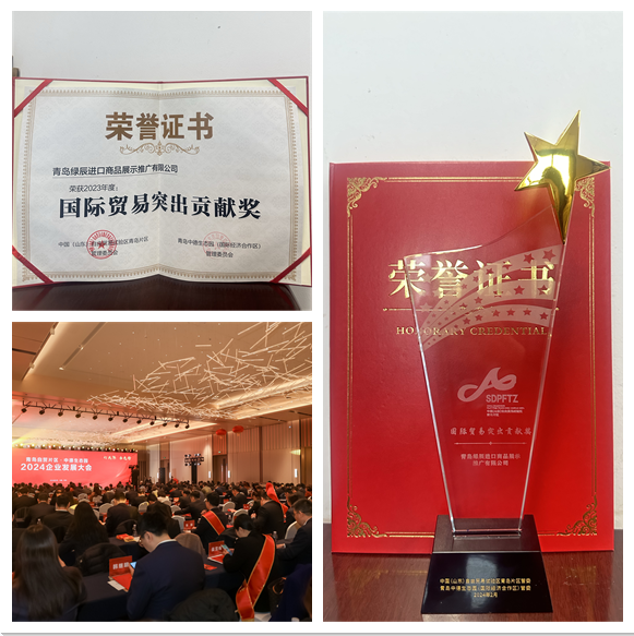 3月5日,中国(山东)自由贸易试验区青岛片区举办2024年企业发展大会,对过去一年为青岛自贸片区经济发展作出突出贡献的优秀企业进行表彰。青岛绿辰进口商品展示推广有限公司荣获青岛自贸片区2023年度国际贸易行业突出贡献奖,为青岛的国际贸易发展注入了新的活力。